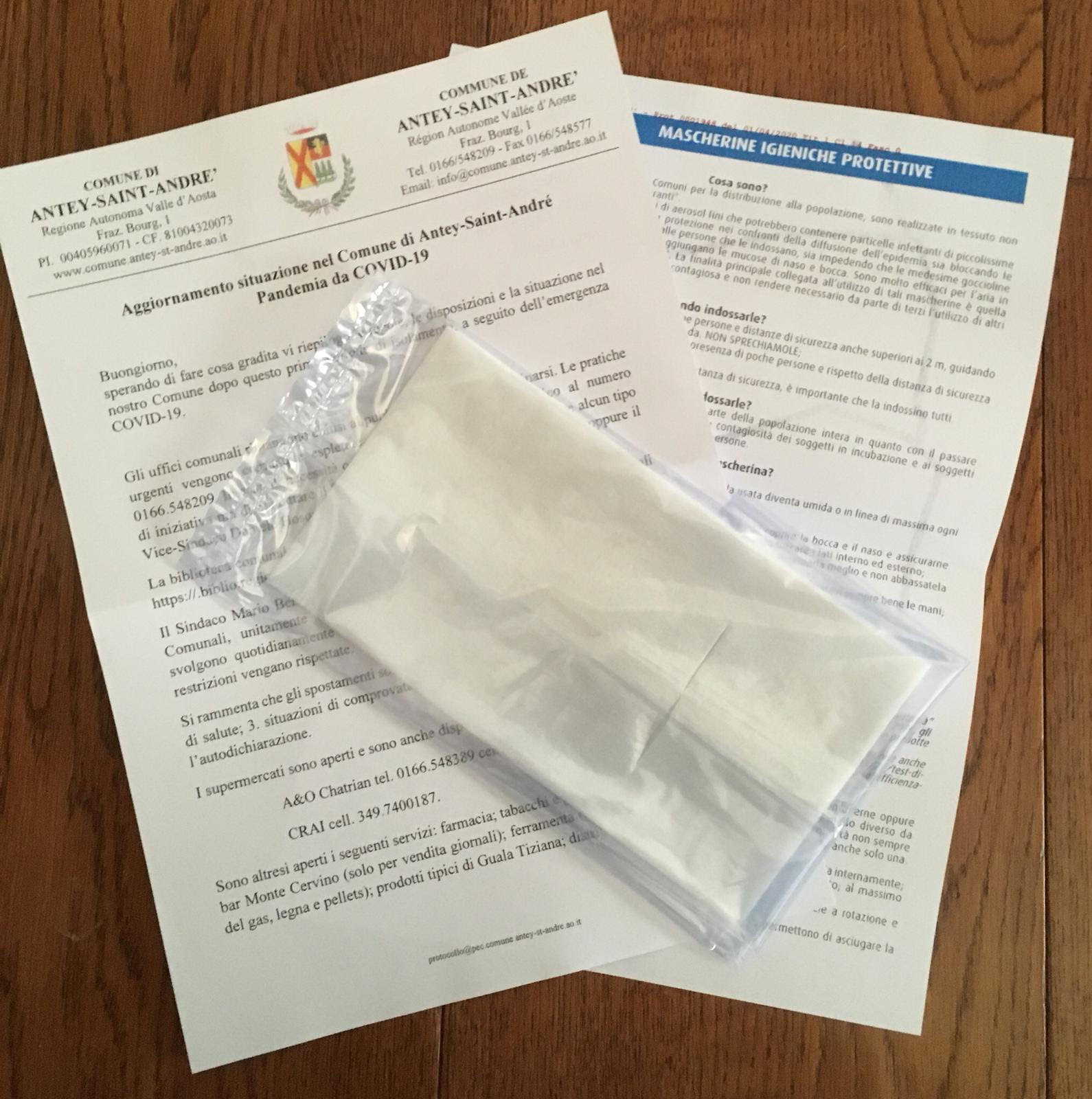 Un sincero GRAZIE a tutti i Dipendenti Comunali, a tutta la Giunta Comunale, al Signor Motta Roberto (Responsabile Funzione Tecnico-Scientifica C.O.C. Antey), al Signor Massimo Brunod (Capo distaccamento Vigili del Fuoco Volontari Antey) ed alla sua “Squadra” che ieri si sono adoperati nella preparazione e nella distribuzione delle mascherine forniteci dalla Protezione Civile di Aosta. “Insieme ce la faremo!”