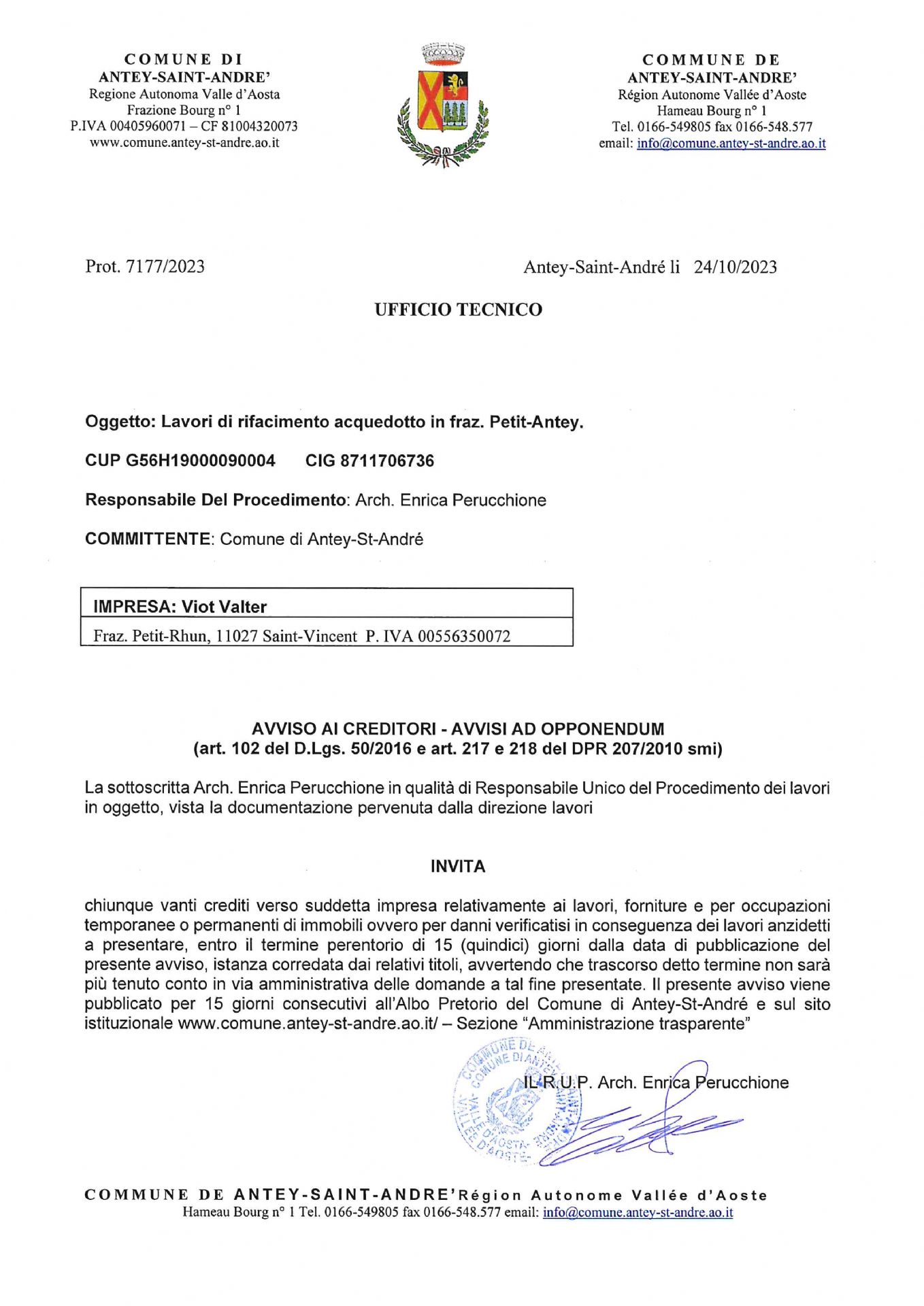 Avviso ad Opponendum_ lavori di rifacimento acquedotto Petit-Antey