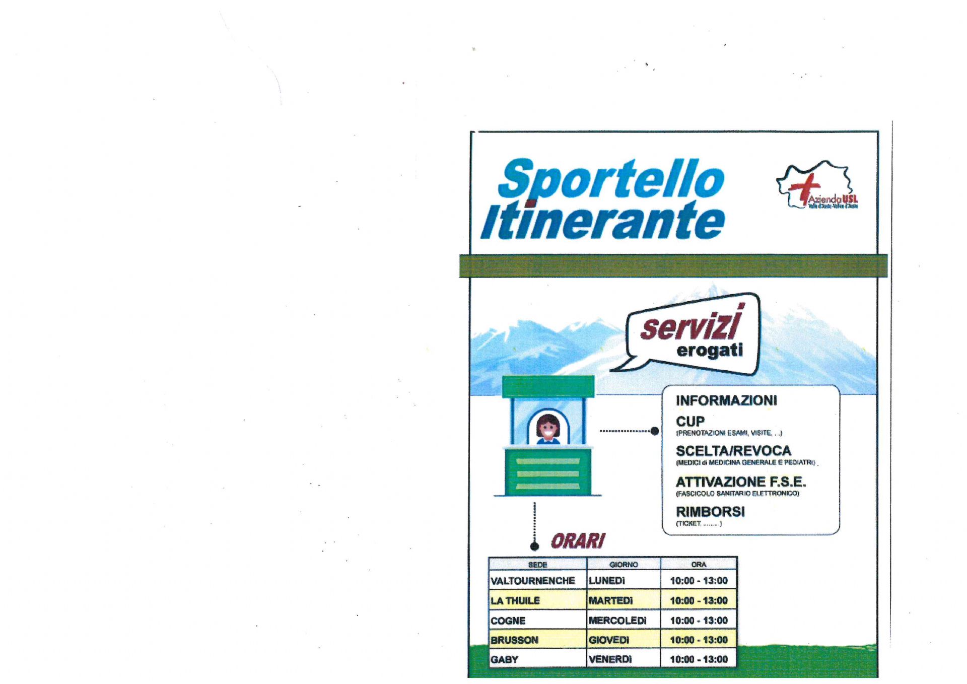 Lo Sportello itinerante, in fase di sperimentazione fino ad aprile 2024, è strutturato su un calendario prestabilito e tenendo conto anche delle giornate di mercato zonale: lunedì a Valtournenche, martedì a La Thuile, mercoledì a Cogne, giovedì a Brusson, venerdì a Gaby.