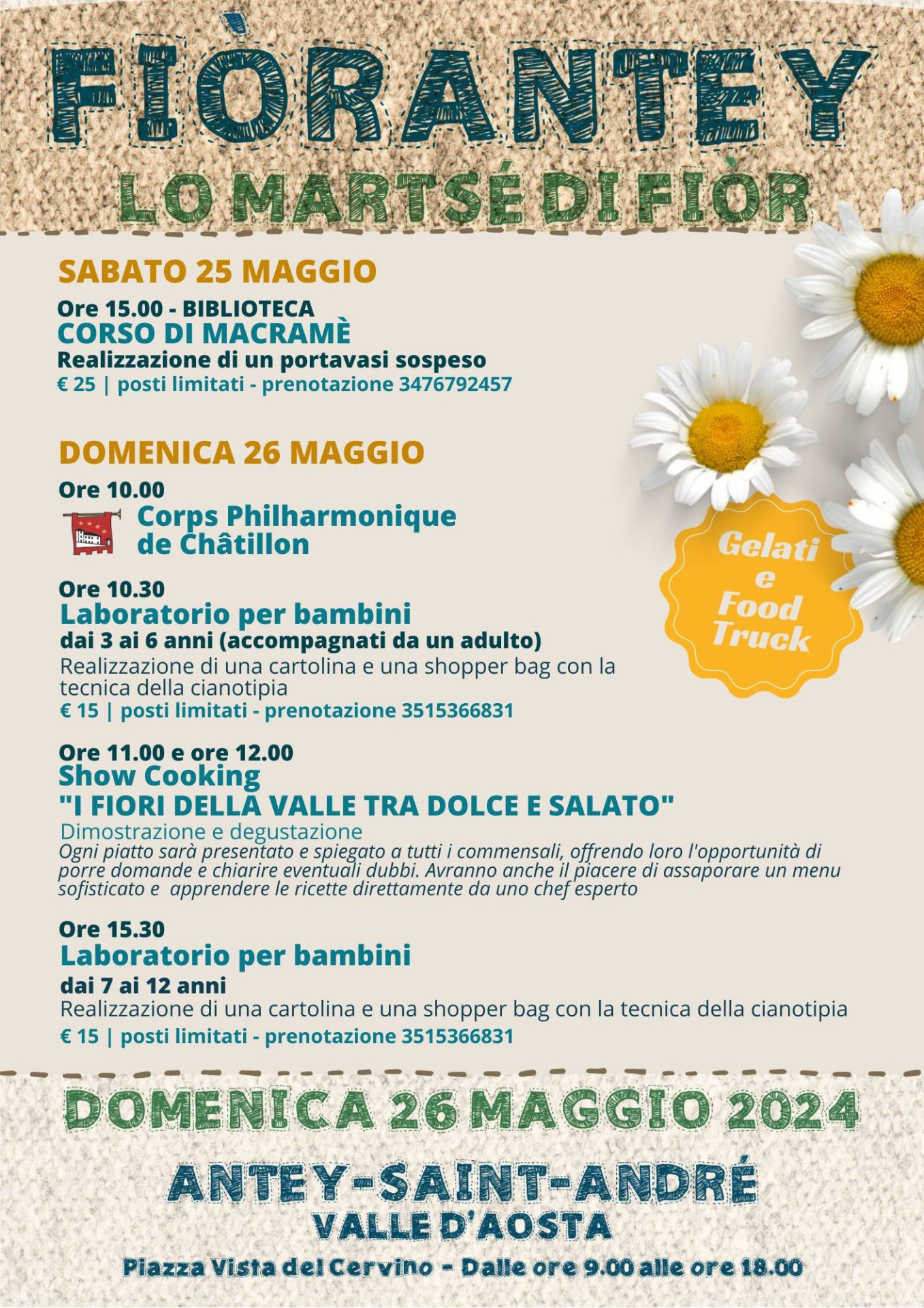 L’ultima domenica di maggio Antey-St-André ospita Fiòrantey, lo martsé di Fiòr. In questo giorno la piazza Vista del Cervino si riempirà di fiori, piante, colori, profumi, forme: un insieme di sensazioni uniche.