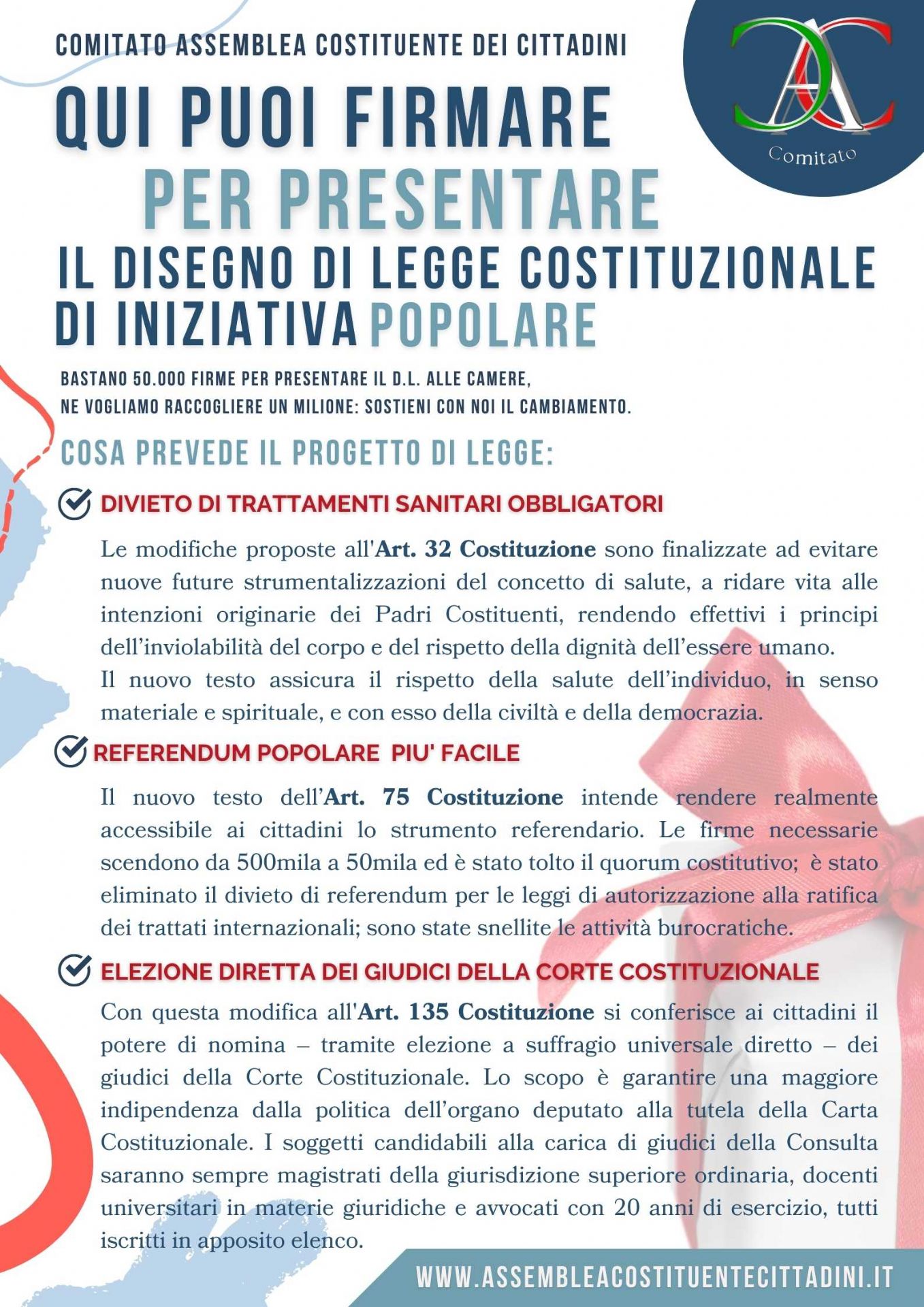 Il 12 maggio 2023 si è costituito il Comitato denominato “Assemblea Costituente dei Cittadini”, presentando presso l’Ufficio I della Corte di Cassazione il progetto di legge costituzionale di iniziativa popolare dal titolo: «Modifiche agli articoli 32, 75 e 135 della Costituzione e alla legge costituzionale 25 maggio 1970, n. 352» (G.U. n.111 del 13/05/2023).
