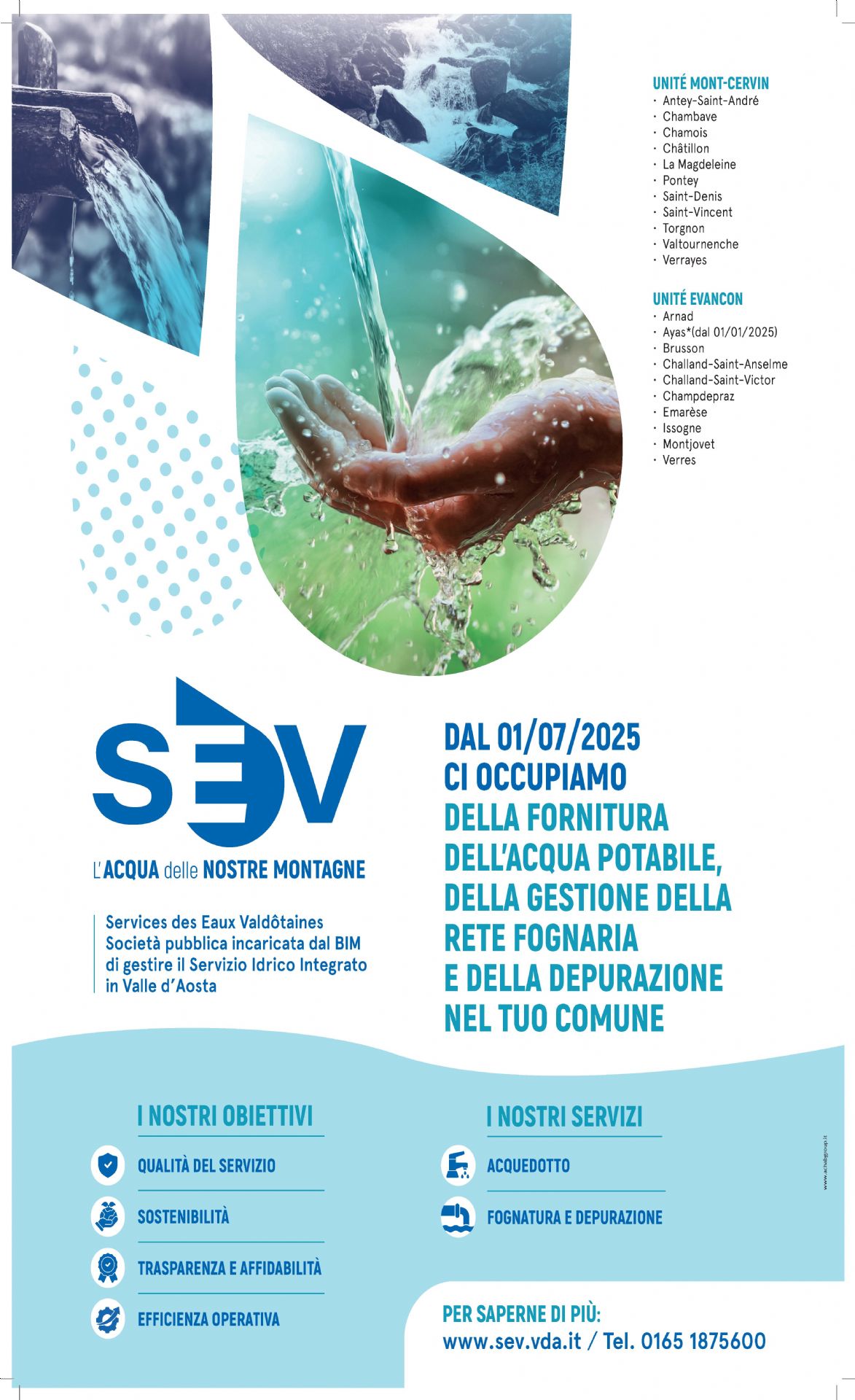 i ricorda che, a partire dal 1° luglio 2025 il Servizio idrico comunale passerà sotto la gestione integrata della società Services des Eaux Valdôtaines (SEV) Srl con sede nel comune di Sarre, frazione La Grenade, n. 27.