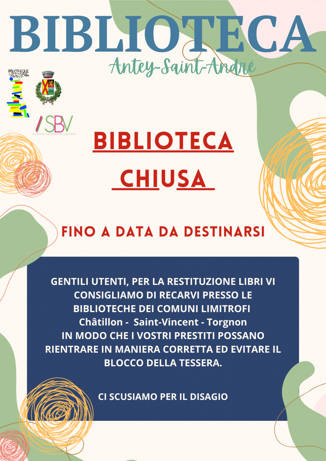 Si avvisa l' utenza che la Biblioteca rimarrà chiusa fino a data da destinarsi.